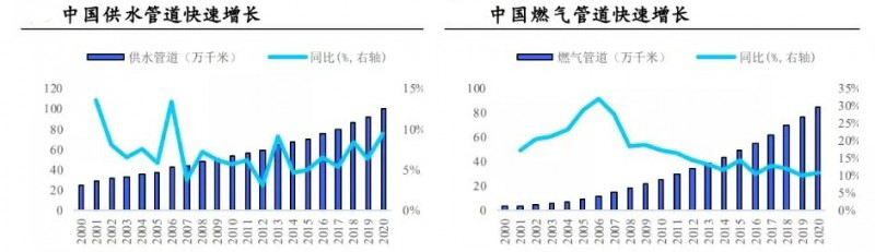 根據(jù)住建部等三部委2022年1月3日下發(fā)的《關(guān)于進(jìn)一步明確城鎮(zhèn)老舊小區(qū)改造工作要求的通知》,城鎮(zhèn)老舊小區(qū)改造應(yīng)“將老舊小區(qū)需改造的水電氣熱信等配套設(shè)施優(yōu)先納入本單位專營設(shè)施年度更新改造計(jì)劃”,且“將存在安全隱患的排水、燃?xì)獾壤吓f管線……作為重點(diǎn)內(nèi)容優(yōu)先列為改造內(nèi)容”。我們認(rèn)為文件進(jìn)一步確認(rèn)了老舊燃?xì)夤艿栏碌钠惹行?,在此背景下,我們預(yù)期我國將迎來城市老化管道集中更新,燃?xì)?、給排水管道需求有望超預(yù)期集中爆發(fā)。