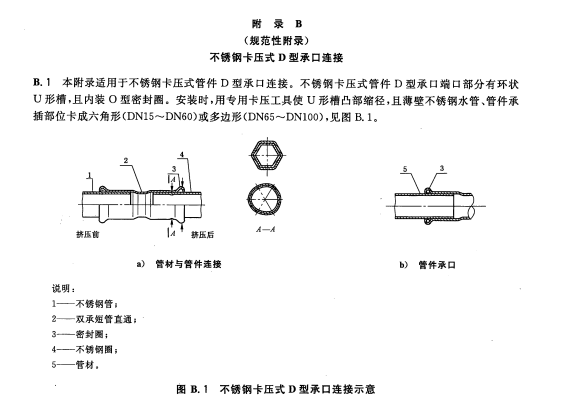 3.3 卡壓式連接(press jointing):以帶有特種密封圈的承口管件連接管道,用專用工具鉗壓承口部位后斷面呈六角型或多邊型壓縮緊固密封的一種連接方式。根據(jù)端部卡壓連接方式分為 D 型承口連接和 S 型承口連接。